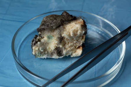 Piece of bread with mold Aspergillus fumigatus in a Petri dish next to tweezers on a blue background. Organic, medical research. The texture of mildew on the bread.