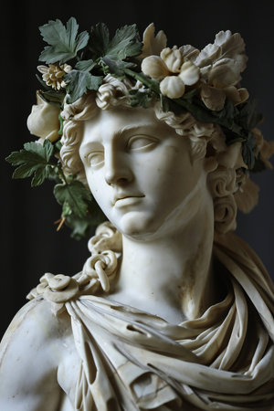 Close-up of an ancient marble statue with intricate details, showcasing classical artistry against a dark background