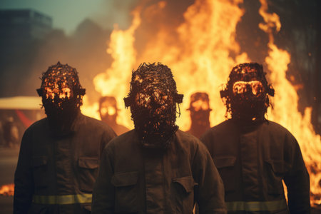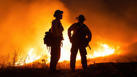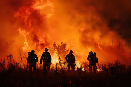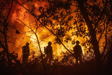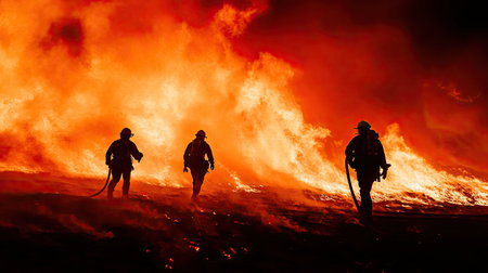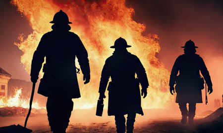 A group of brave fighting firefighters a raging inferno, their silhouettes illuminated by the flames as they work tirelessly to contain the blaze and save lives.