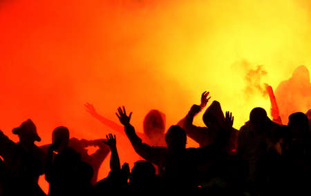 Live rock performance, vocalist silhouette on stage, energetic crowd, space for text