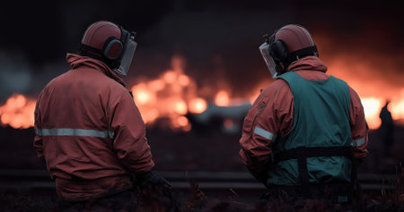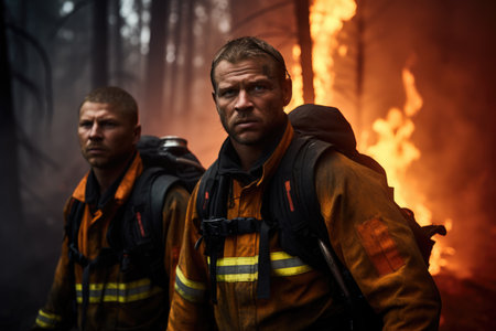 Fighting Fire's Fury: Close-up of male firefighters confronting the fury of a blazing forest, exemplifying bravery