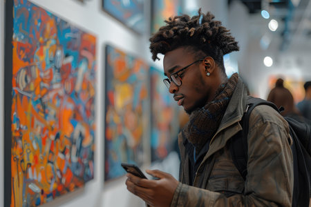 A young art enthusiast stands contemplatively in an art gallery, phone in hand, surrounded by vibrant abstract paintings.