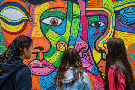 Three young women are looking at a colorful painting of two faces. The painting is full of bright colors and has a unique style. The women seem to be admiring the artwork and discussing its meaning