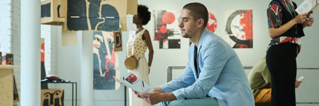 Banner of young male visitor of modern art exhibition looking through list of expositions represented at vernissage