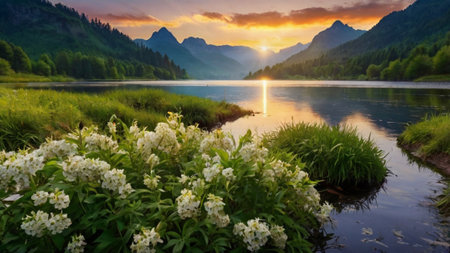 Mountain lake with blooming white flowers at sunset. Landscape.
