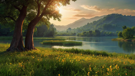Beautiful summer landscape with lake, trees and meadow at sunset
