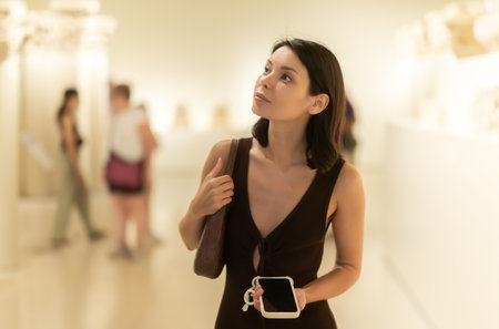 Woman visiting art gallery her looking pictures on wall watching photo frame painting at artwork museum people lifestyle concept.