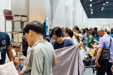 Bangkok, Thailand - December 21, 2019 : Unidentified asian woman feeling happy when her choose a goods product for shopping purchase in department store or exhibit hall expo OTOP