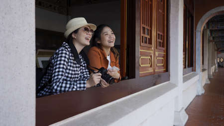 Two smiling friends using the mobile together in a garden of a buddhist temple