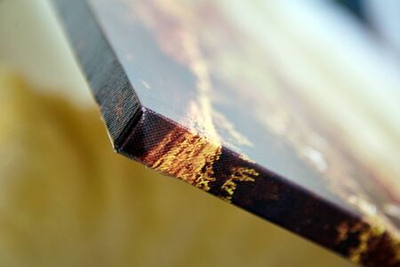 Gallery wrap canvas print without decor frame. Photo printed on a glossy cotton canvas on blurred background. Corner of photography stretched on stretcher bar, lateral side, closeup, selective focus