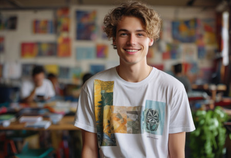 A smiling male student stands in a vibrant classroom environment, his casual attire and joyful expression speak of a positive educational experience.