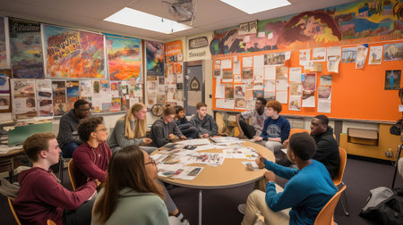A teacher passionately explains various art techniques to a captivated group of students, fostering creativity and discussion in an artistic environment filled with vibrant artwork.