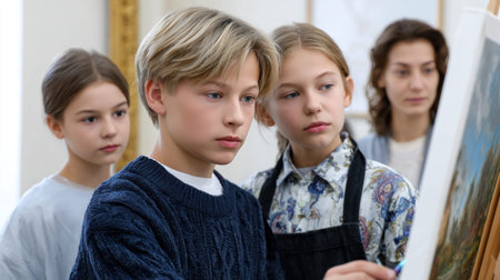 Children attentively paint on easels in an art studio, expressing their creativity