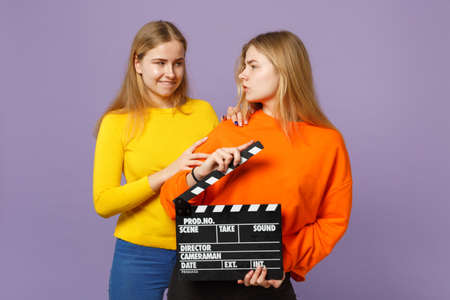 Two funny young blonde twins sisters girls in colorful clothes holding classic black film making clapperboard isolated on violet blue background. People family lifestyle concept. Mock up copy space