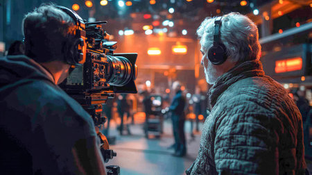 A film director and cameraman with headphones filming in a studio setting. Warm lighting adds depth, highlighting the professional and creative environment.