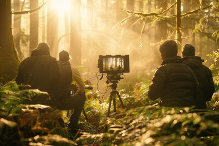 Behind-the-scenes view of a film crew in a forest with the camera focused on the crew and actors, bathed in the warm light of the setting or rising sun.