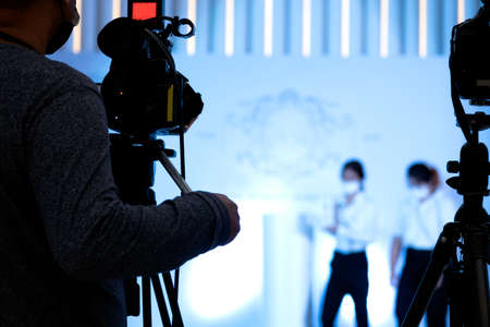 professional video production camera recording live event on stage. television social media broadcasting seminar conference.