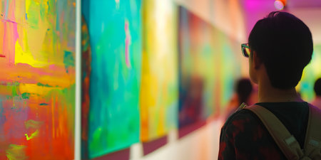 A young man observes colorful abstract artwork in a modern gallery, representing culture, appreciation, and creativity.