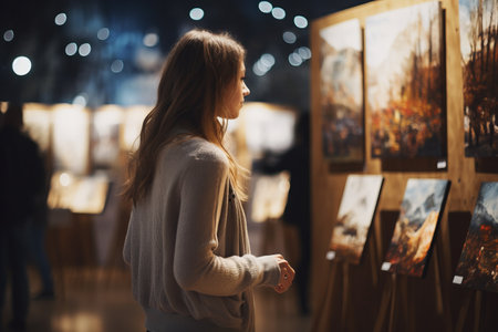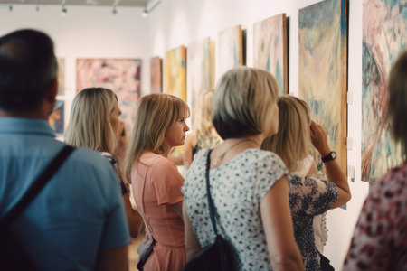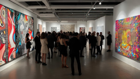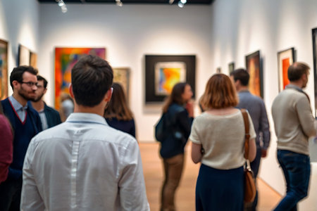 Visitors engaging with art in a vibrant gallery setting, appreciating creative masterpieces