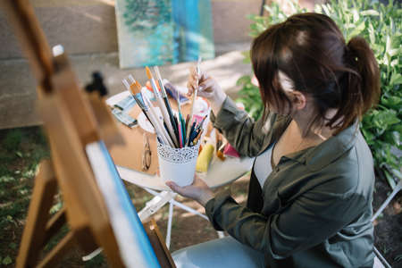 Brunette woman holding pot with paint brushes outdoor. Woman artist sitting in garden and taking paintbrush while holding pot with brushes and pencils.