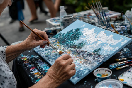 A person creating a colorful painting on a table with art materials nearby.