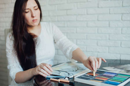 Beautiful young woman artist drawing in a comfy home interior