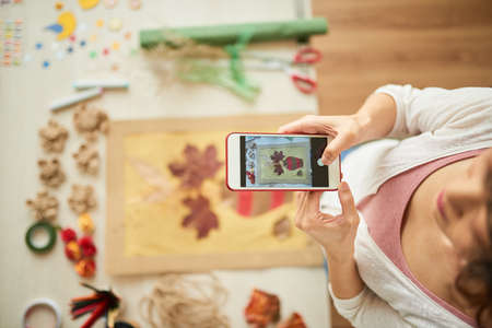 High angle view of young woman in casualwear standing at wooden table and taking picture of just finished handmade decor, focus on foreground