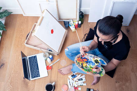 Professional female artist using colour palette painting on canvas.