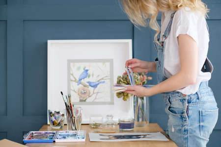 Happy female artist painting picture in her creative workplace.