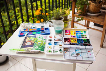 watercolor paints and paper closeup for drawing, artistic creation at home, workspace for make creative artwork