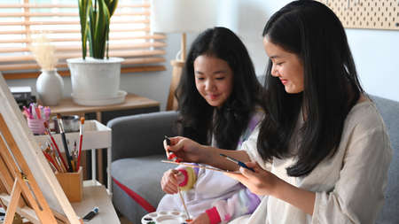 Two little girls or siblings enjoying painting with water color at home.