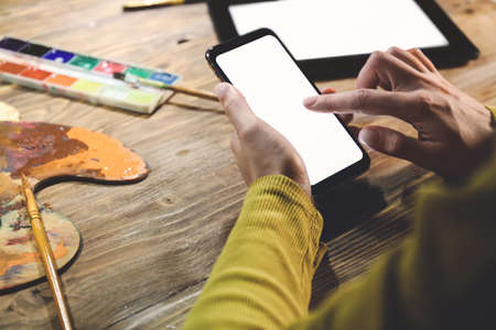 A creative person is in his studio. The artist creates digital content for social networks. The young artist sends photos of his works via messenger. DIY concept, artist's studio.