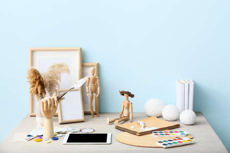 Creative composition with wooden mannequins and artist supplies on table