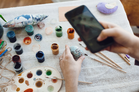 Happy Easter. Hands holding phone and taking photo of stylish easter flat lay of painting egg on rustic table with paint,brushes, bird toy. Easter workshop