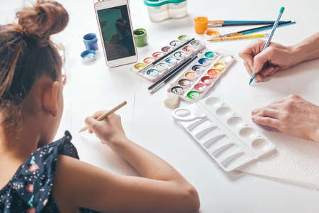 A cute schoolgirl sits at a table with her mother and watches an online drawing lesson. The use of online and internet technology in everyday life. Lifestyle photo. Back view