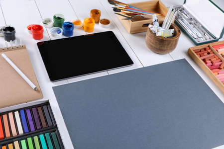 Blank sheet of paper, colorful chalk pastels, tablet and other drawing tools on white wooden table. Modern artist's workplace