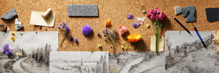A collection of various plant images and textures arranged creatively on a corkboard, reflecting the beauty of a wild garden in an artistic moodboard design, banner