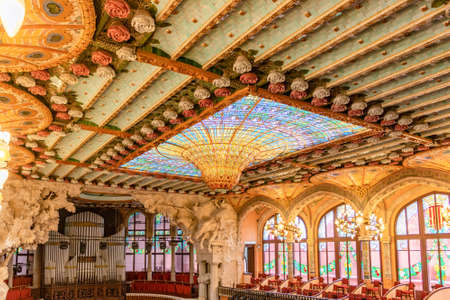 Barcelona, Spain-September 27, 2021: Detail of stained glass ceiling of the Palau de la Música Catalana.