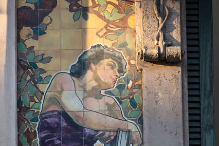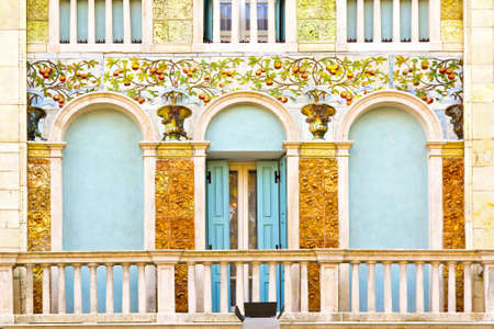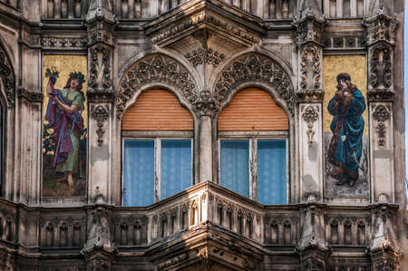 Architectural balcony of a public building in Budapest, Hungary. It is Decorated with mosaics depicting female figures