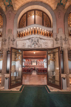 Barcelona, Spain - Feb 24, 2020: Entrance to grand hall inside Catalonia Music Hall with floral ornamentation