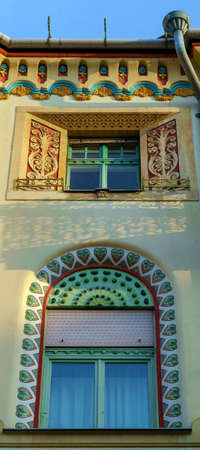SUBOTICA / VOJVODINA, SERBIA - APRIL 28, 2018: Architecture detail in art nouveau style at one building build circa 1900. Subotica is second town in the region of Vojvodina.
