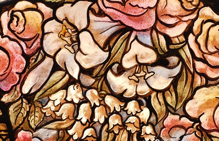Closeup of flowers hand painted on vintage glass window backlit by sunlight