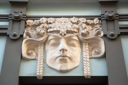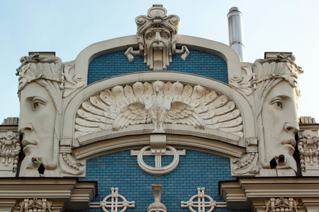 RIGA, LATVIA - JULY 11, 2017: Bas reliefs on facade of buildings in Art Nouveau style, located in historical Quiet Center on Elizabetes street.