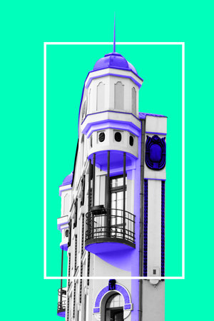 Poster. Contemporary art collage. White art deco building with purple accents. Vibrant abstract design. Concept of modern culture, architecture, aesthetic, journey and tourism. Ad