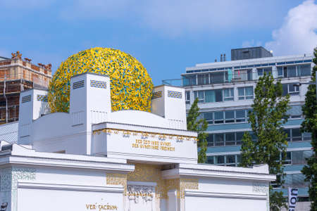 Vienna, Austria, 31 JUL 2019: 3000 gilt laurel leaves on the golden dome Secession Building, was designed by architect Joseph Maria Olbrich in 1897 as the manifesto of the Secessionist movement