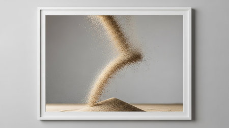 A gust of wind lifts fine dust off a sandy surface, creating a dynamic spectacle against a neutral backdrop. The grains of sand dance and scatter in the breeze, emphasizing movement.