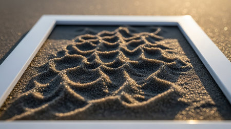 Textured sand forms wave-like patterns within a white frame, illuminated by golden light.