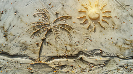 A palm tree and sun drawn on the sandy shore, creating a tranquil scene of coastal creativity.