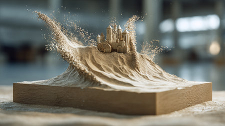 This image features an intricate sand sculpture resembling a natural landscape. The unique texture and shadows highlight the artistry, inviting creativity and inspiration.