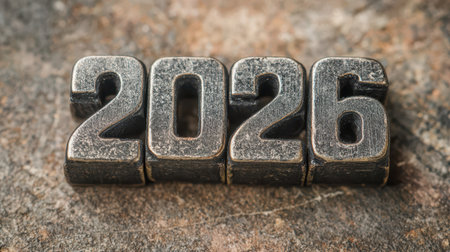 Bold metal numbers present the exciting arrival of New Year 2026 mixed with rustic textures capturing a moment of anticipation and renewal.